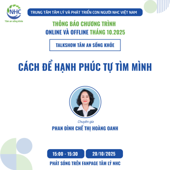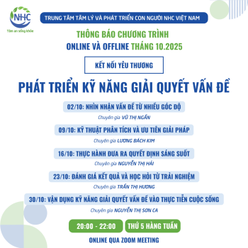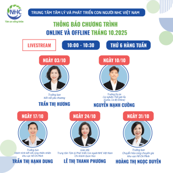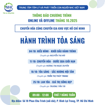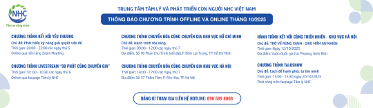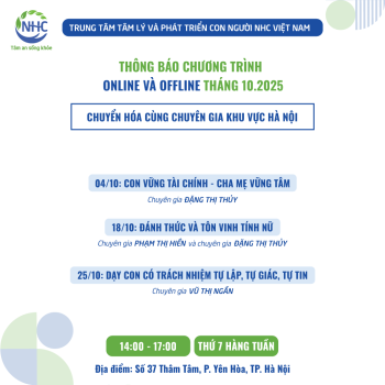 Trung tâm Tâm Lý NHC Việt Nam xin thông báo đến toàn thể quý khách hàng thông tin các chương trình tháng 10 năm 2025 được tổ chức tại Trung tâm và tổ chức online theo nội dung, lịch trình như sau: